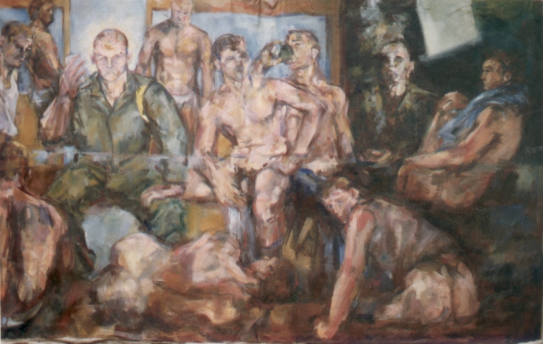 Des amis en banlieue, dans une vieille boutique de boucher avaient installé sur une estrade une longue table de verre. J'ai fait ce tableau d'environ 3,30m pour décorer le mur. L'ai-je vendu ? donné? je ne me souviens pas ! L'avenir le fasse à place.